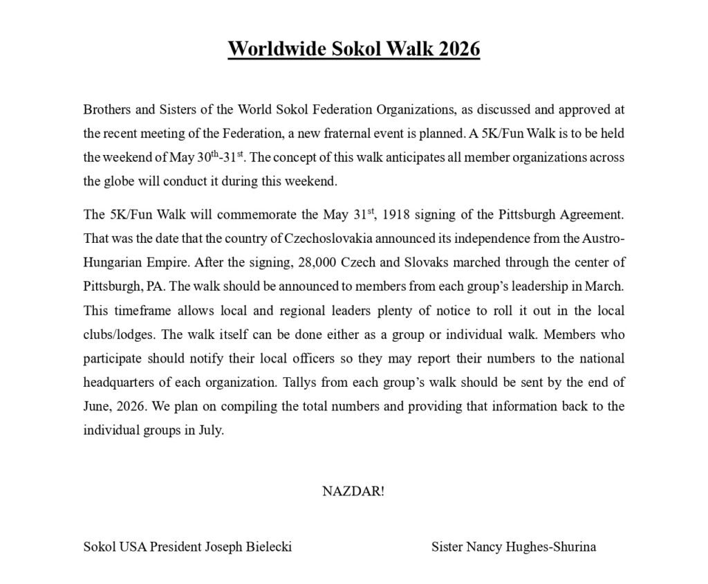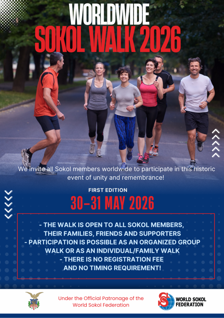 The World Sokol Federation is proud to announce the first edition of the Worldwide Sokol Walk 2026, a global fraternal event held under the official patronage of the World Sokol Federation. The Slovak Gymnastic Union Sokol of the USA, as the official host for 2026, warmly invites all Sokol members, their families, friends and supporters worldwide to participate in the Worldwide Sokol Walk 2026!